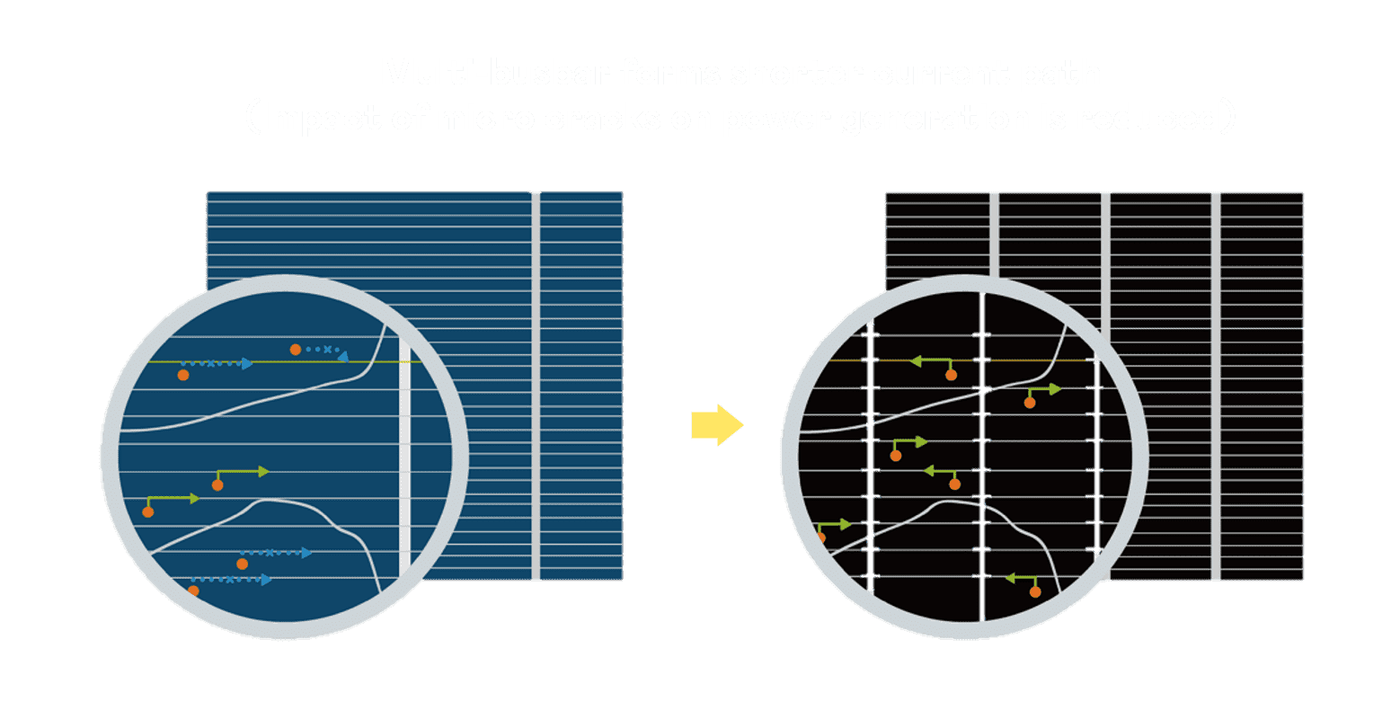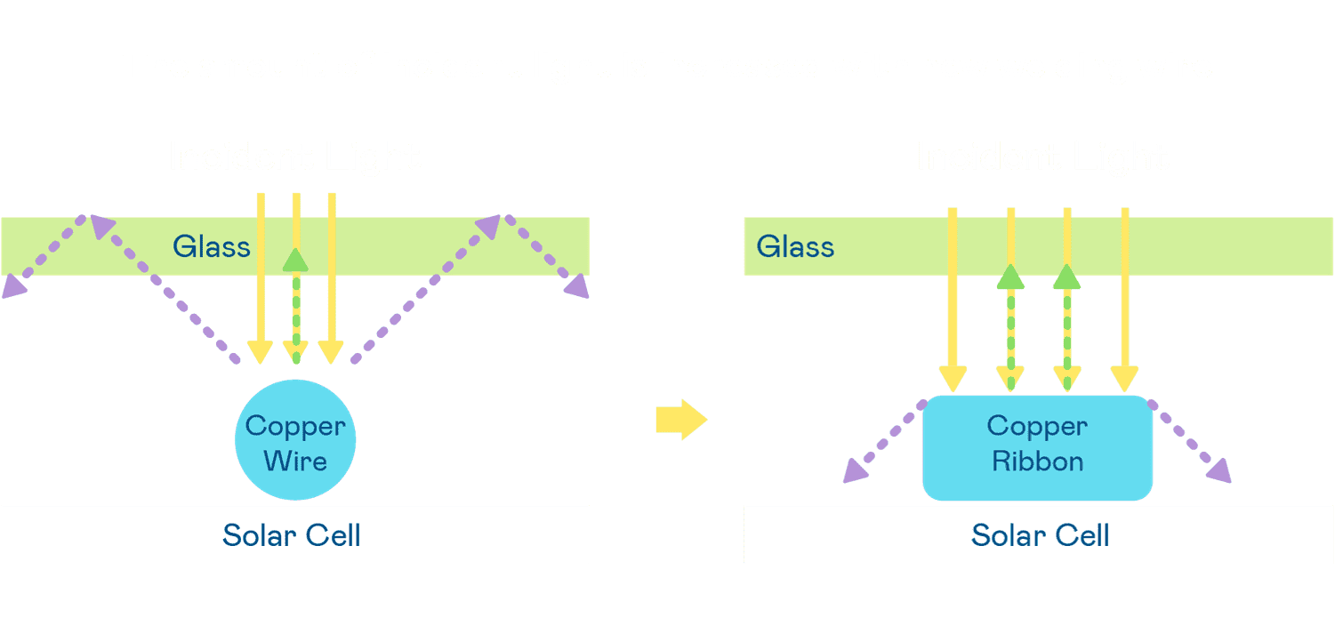 • 电池使用多条铜导线 (Copper wire) 于电池片上形成较短的电流路径,,,,提高电流收集效率,,采用圆形设计的铜导线较传统扁平式的铜焊带 (Ribbon),,可增加入射至电池的光线量。。。