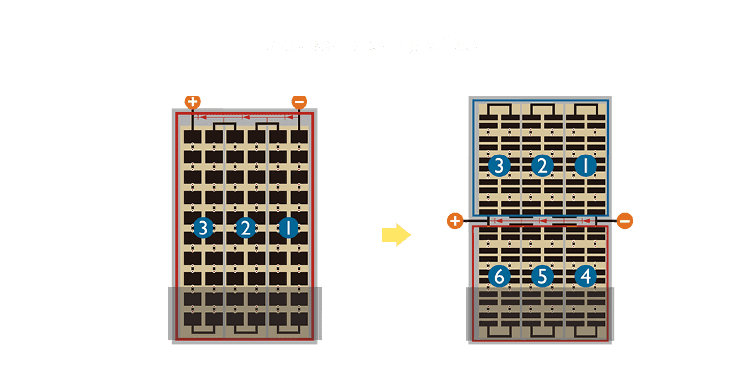 • 结合半切电池,,降低遮阴影响、、提升模组抗隐裂能力、、、并减少电阻损耗,,,进一步提升模组发电效能。。。